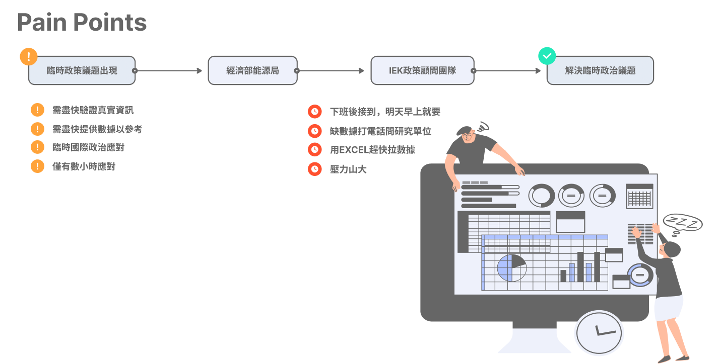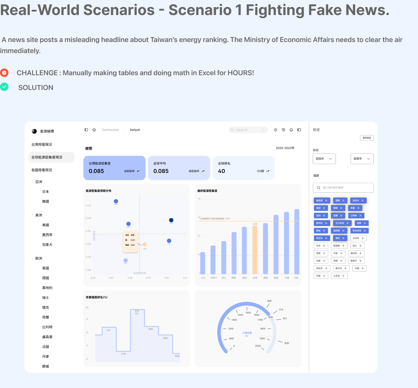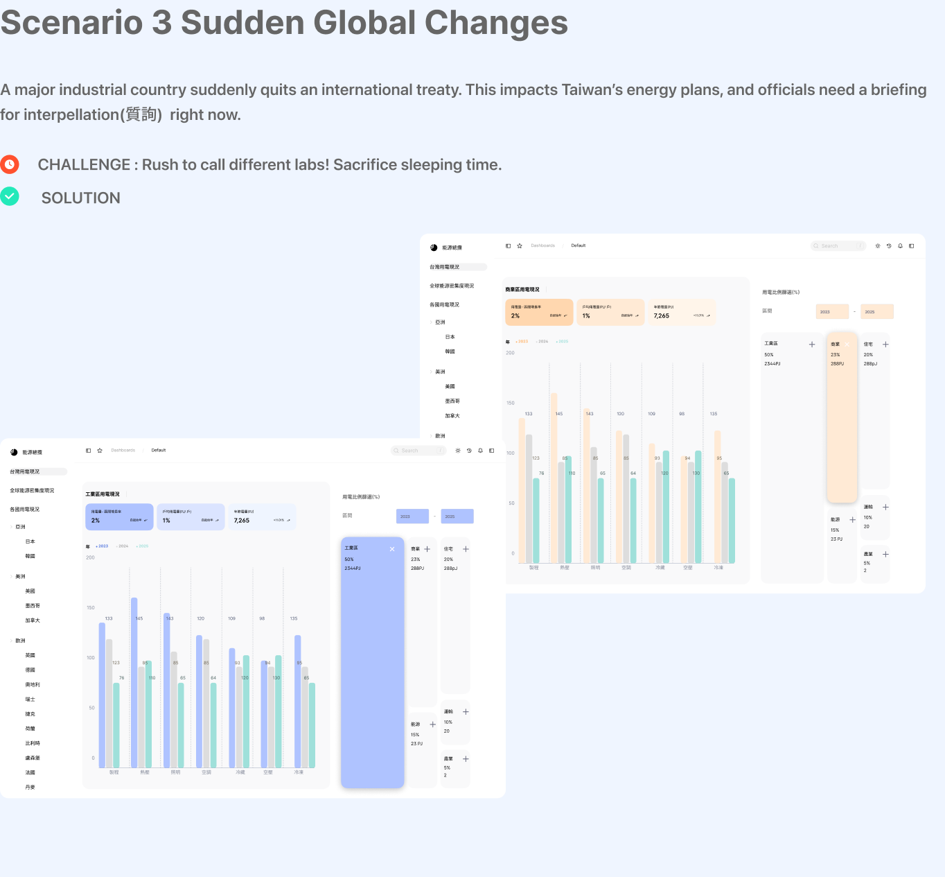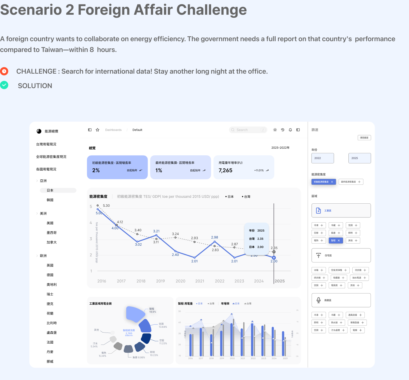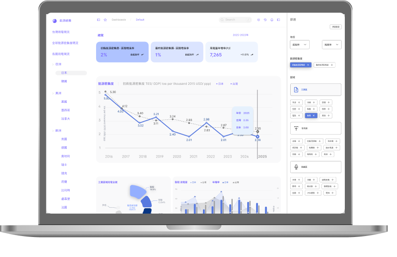 Energy efficiency is a global goal and a top priority for Taiwan. In the real world, political issues happen irregularly which often need rapid responses to the public or policymakers. Without real-time responses, negative perspectives spread fast. The ITRI Consulting Center developed a dynamic platform based on the pain points from policymakers. Our design includes : (1.) Local Focus: Tree Map to see exactly how different regions in Taiwan use power. (2.) Global Context: Comparing energy efficiency across different countries. (3.) World Trends: Seeing where Taiwan stands in the global energy landscape.