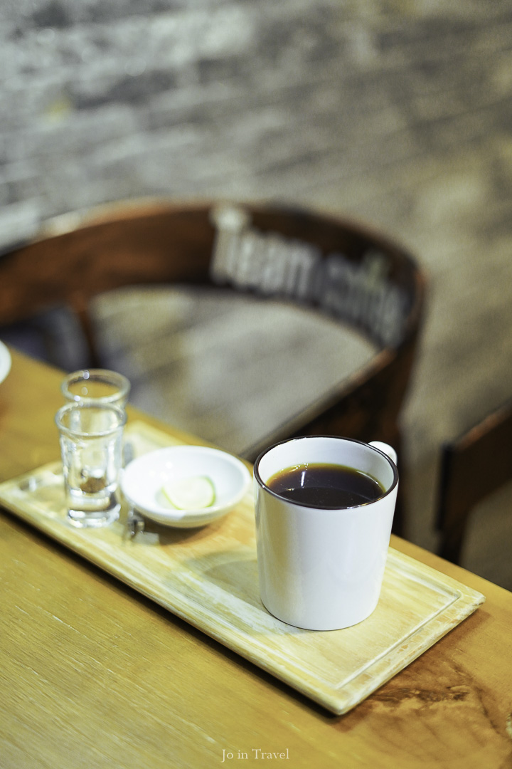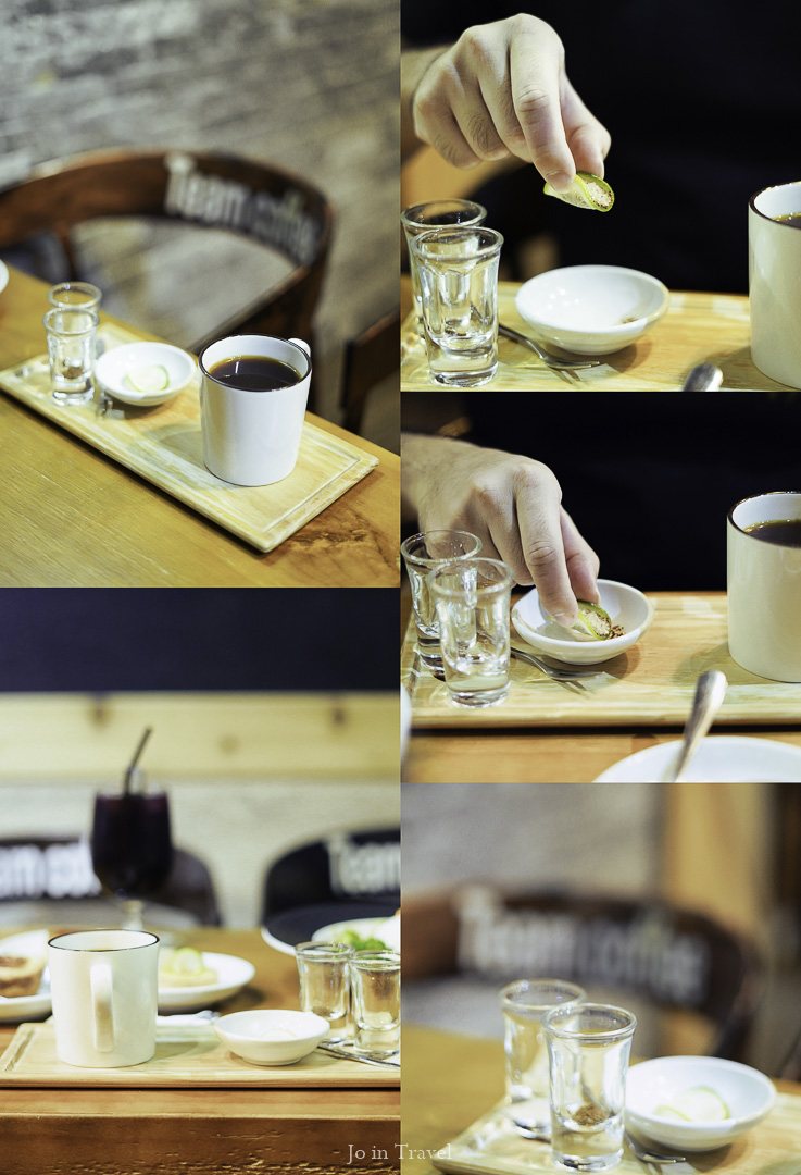 檸檬蘸上砂糖和咖啡粉食用(蠻酷的)。香水檸檬不酸,二砂糖的甜味咖啡粉的苦味與檸檬的酸味交錯出奇特的口感,尾韻帶一點檸檬皮的苦澀, 接著喝上一口肯亞AA咖啡,很享受。